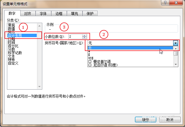 2、[分类] 中选择会计专用, [货币符号(国家/地区)(s)] 选项选择“无”。如果不需要显示小数,小数位数修改为0。确定