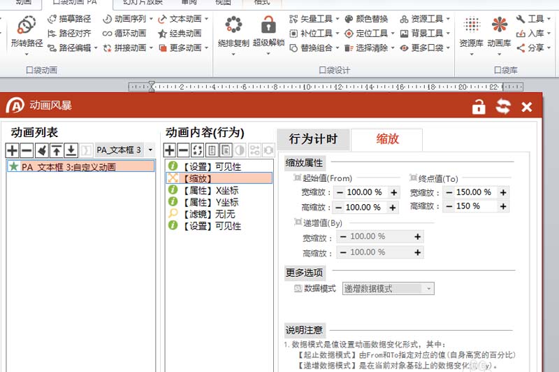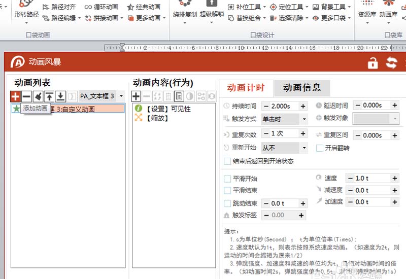 3、执行口袋动画-动画风暴命令,添加自定义动画,动画内容添加缩放动画。