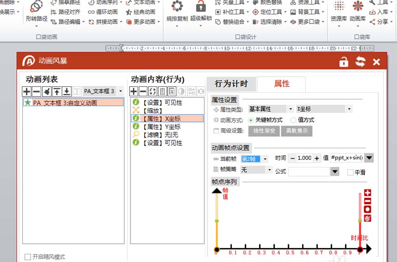 6、修改x坐标属性中的动画帧点设置为#ppt_x,接着当前帧选择第二帧,修改其值为#ppt_x+sin(rand(10))/10。