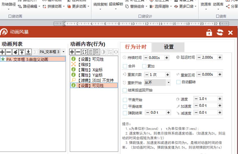 8、切换到可见性,设置属性值信息为关闭,切换到行为计时,设置从0.001延迟到2.000,关闭窗口。
