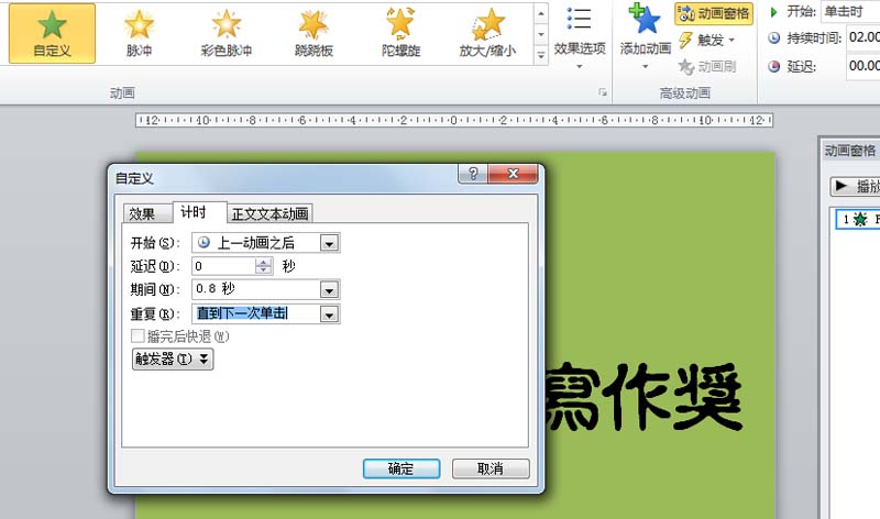 9、执行动画-动画窗格命令,双击动画弹出自定义窗口,设置效果中的动画文本为按字母,设置计时为上一动画之后,期间设置为0.8,重复设置为直到下一次单击,按f5测试动画。