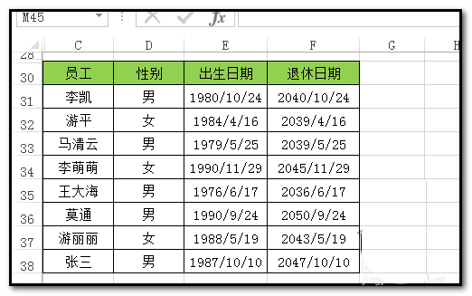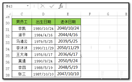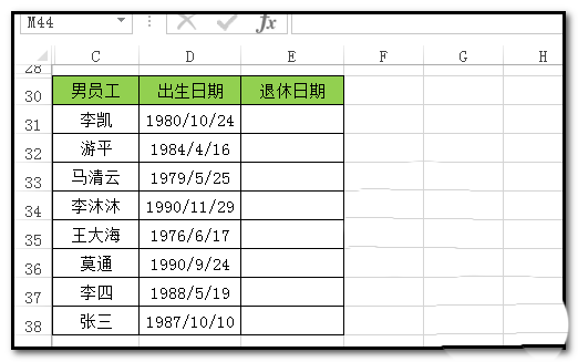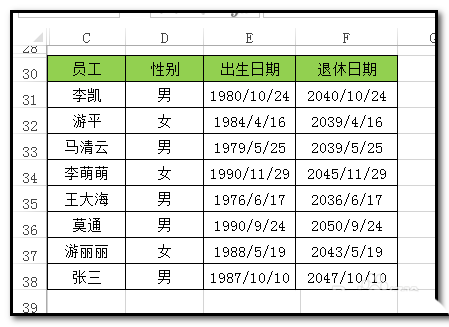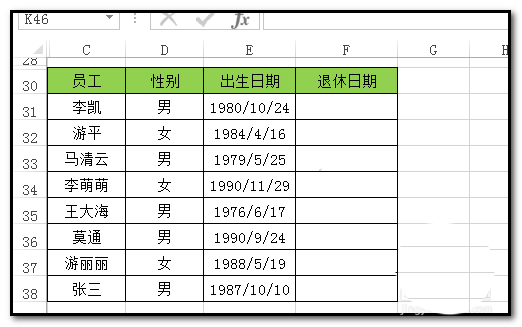 1、图中有这么一个表格数据,现在,要计算出该公司男员工的退休日期。比如,男性的法定退休年龄是60岁。