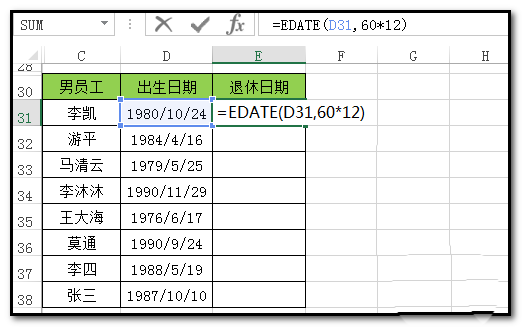 2、那么,我们用EDATE函数来计算。在E31单元格输入公式:=EDATE(D31,60*12)
