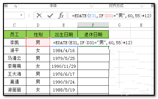 6、比如,男性法定退休年龄是60岁;女性法定退休年龄是55岁。那么,在表格,我们要判断该出生日期是女性的还是男性的,我们以D列的性别来判断。那么,公式,我们就要这样写了:=EDATE(E31,IF(D31="男",60,55)*12)
