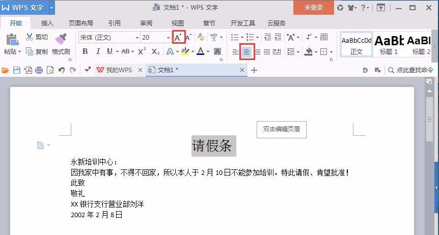 3、选中请假条,然后选择居中对齐,并多次点击“增大字号”,使文字大小合适为止,
