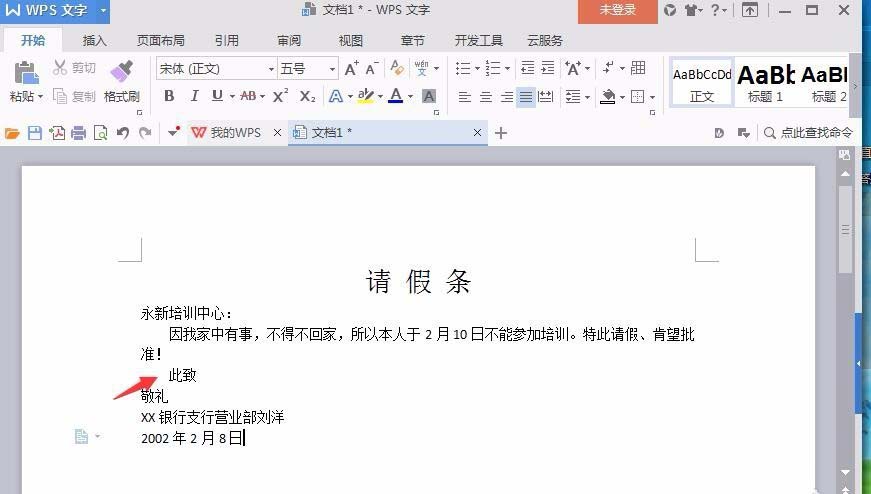 4、在“请”和“假”之间分别增加一个空格,如图所示。