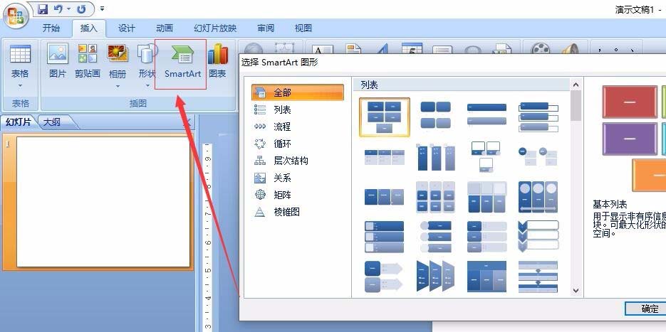 3、接着,点击上方的SmartArt, 根据你的需要,选择各种图形,如图所示