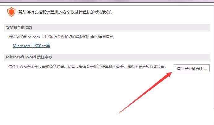 4、在右侧窗口中我们找到Microsoft Word信息中心一项,点击“信任中心设置”按钮