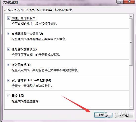 7、这时会打开文档检查器窗口,在这里点击下面的“检查”按钮