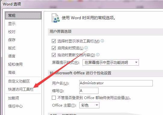 3、在打开的Word选项窗口中,我们点击左侧边栏的“快速访问工具栏”菜单项