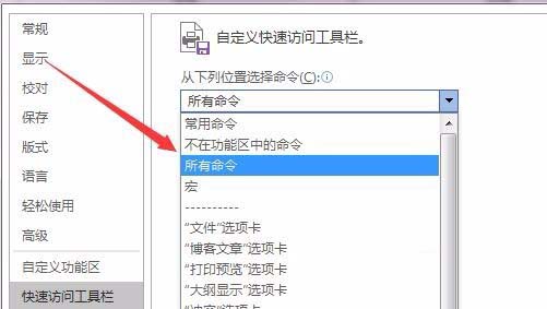 4、接着在右侧的“从下列位置选择命令”下拉菜单中选择“所有命令”菜单项