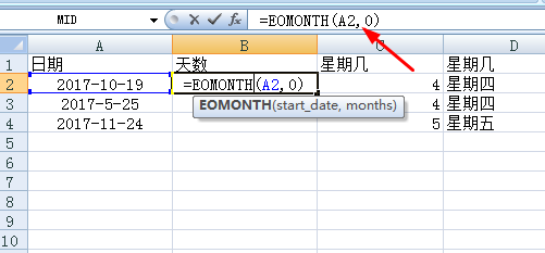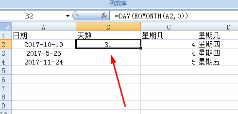 5、把B2单元格函数修改成:=DAY(EOMONTH(A2,0))