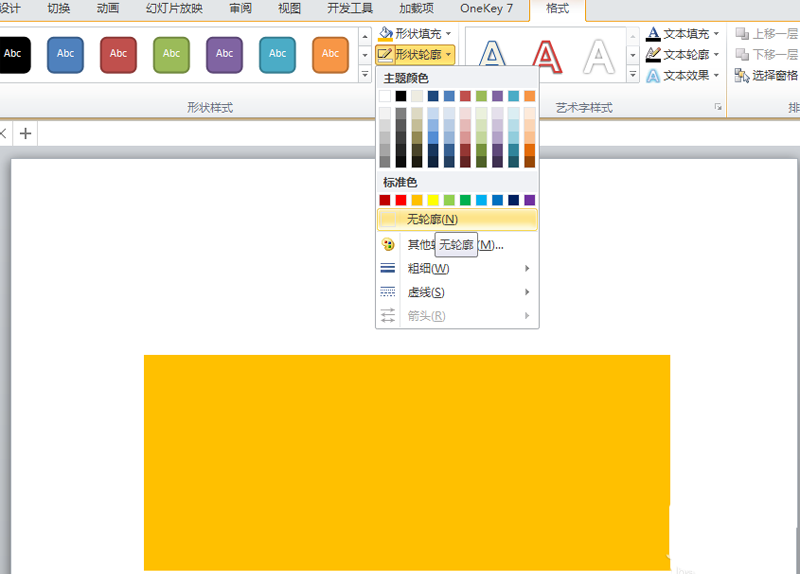 2、选择矩形,执行格式-形状填充命令,填充橙色,设置形状轮廓为无轮廓。