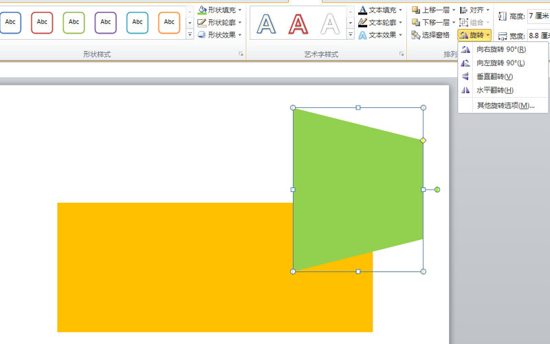 4、选择梯形,执行格式-旋转命令,选择向右旋转选项,调整其位置使其和矩形相接,形状组合在一起。