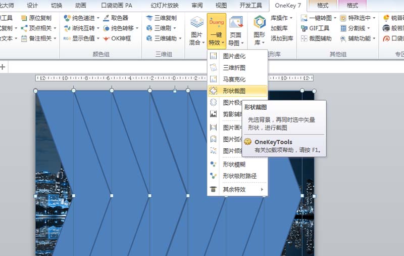 4、选择所有的图形和图片,执行onekey7-一键特效-形状裁图命令,接着删除背景图片。