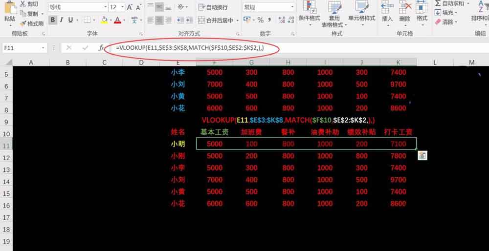 7、把数据源中第一行所有单元格都设置好固定后,就可以下拉了,这时候只有E11会随着下拉变为E12/E13/E14.....其它的值都是固定不变的,所有就会出现如图所示的效果,每一行的名字不同,数据也会随着改变!