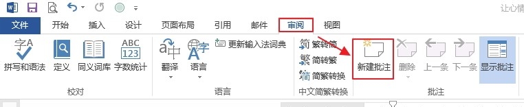 2、在“审阅”选项卡,“批注”组单击“新建批注”。