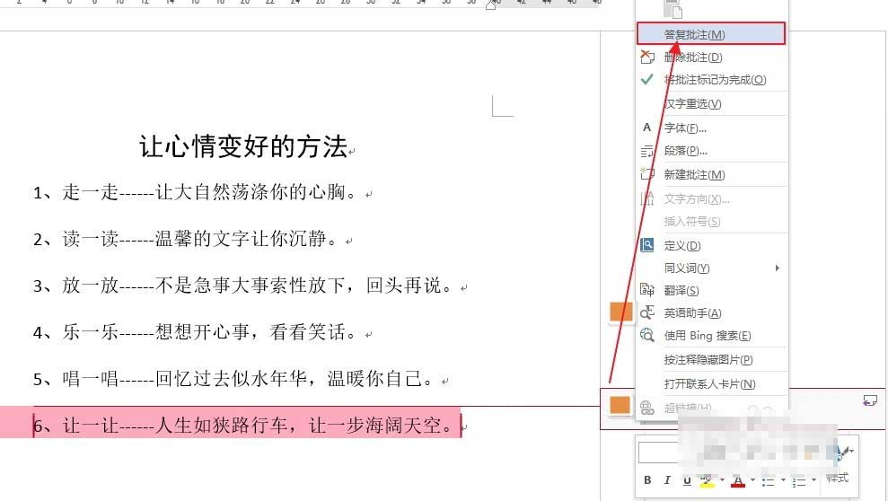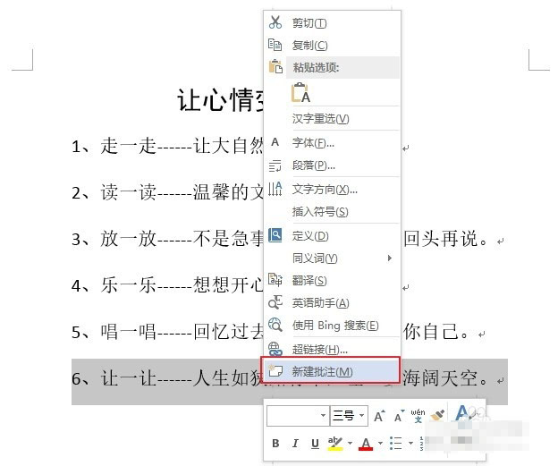 4、还可这样操作:选中需要批注的文本,然后右击,选择“新建批注”,这时文档右侧会自动添加一个空白批注,在其中输入批注的内容即可。