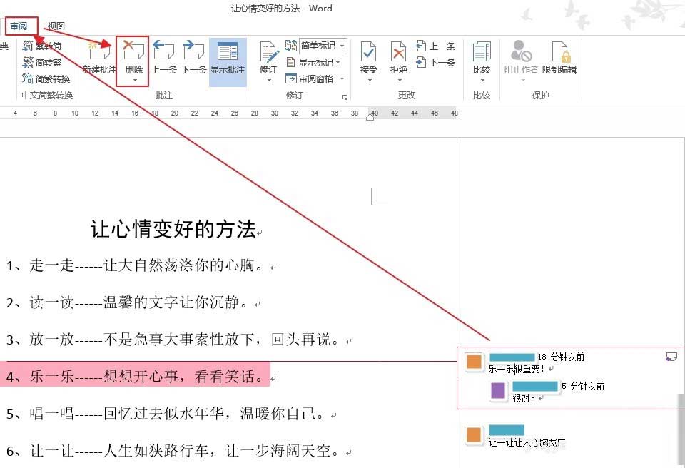 选择批注,然后在“审阅”选项卡,“批注”组单击“删除”即可。