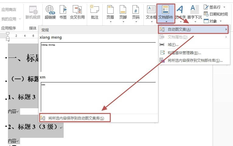 2、在“插入”选项卡,单击“文档布局”,选择“自动图文集”,然后单击“将所选内容保存到自动图文集库”。