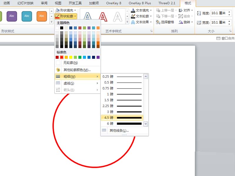 2、选择正圆,执行格式-形状填充命令,设置填充颜色为无颜色填充,形状轮廓为红色,粗细为4.5磅。