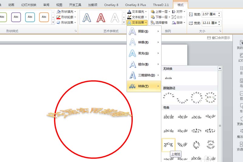 3、执行插入-艺术字,选择一种样式并输入文字内容,设置文本效果为转换里的上弧形,。