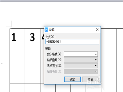 4、然后在点击表格工具之后,就会看到在工具栏的右边有“公式”的按钮。然后点击“公式”按钮。然后弹出的窗口中填入sum(left)