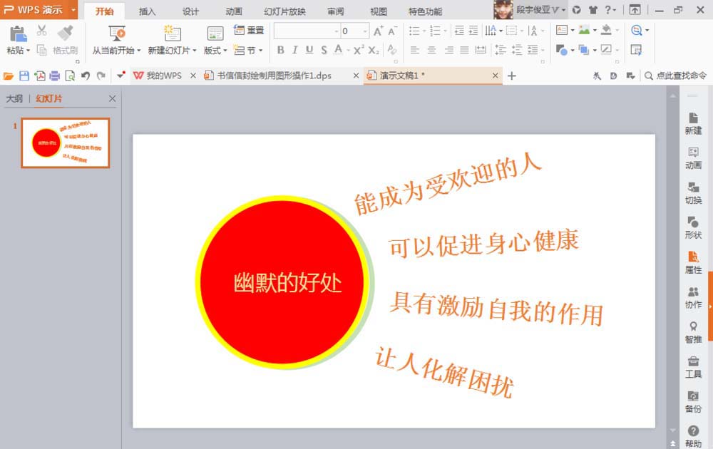 8、选中无轮廓圆形,按下左方向键,向左移动调整,选择插入文本框,输入文字,幽默的好处,选中字体,修改字体颜色为白色。如图