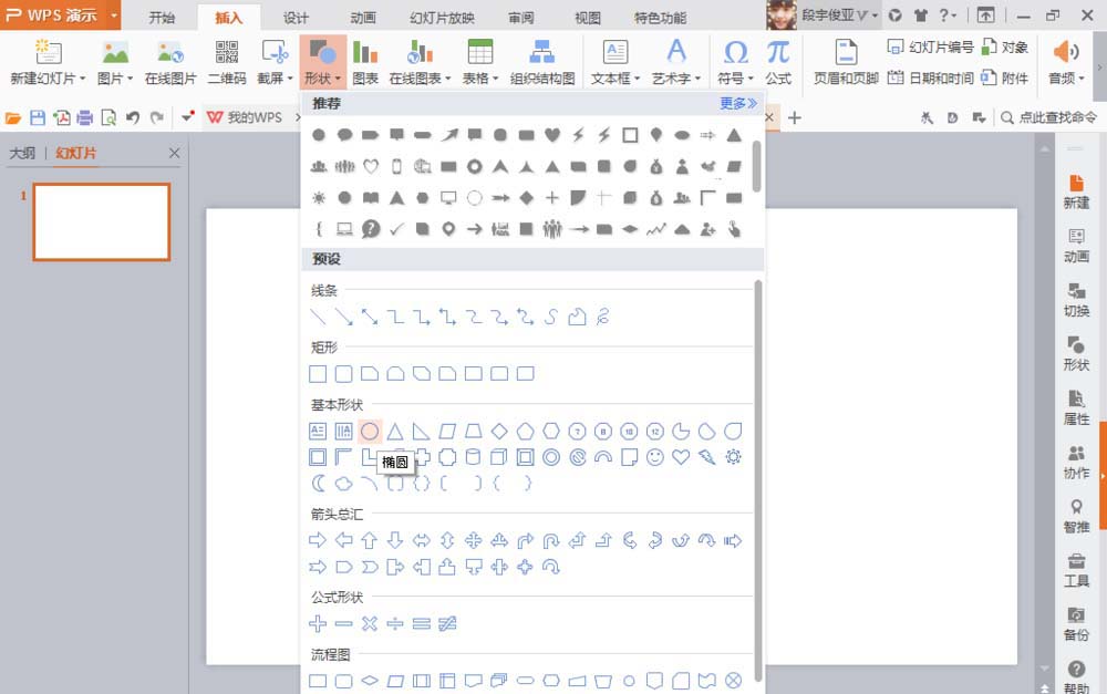 4、选择插入选项,选择形状工具,想绘制圆形可选择椭圆形工具。如图