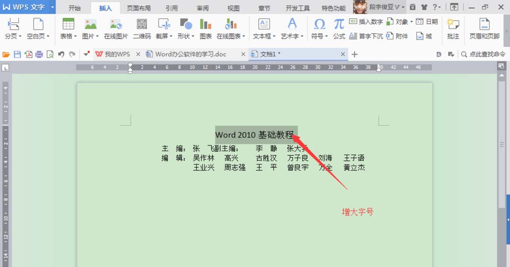 3、选中文字标题,按下快捷键Crl+shift+(>)大于号增加字符的字号。按下Crl+shift+(<)小于号缩小字符的字号。