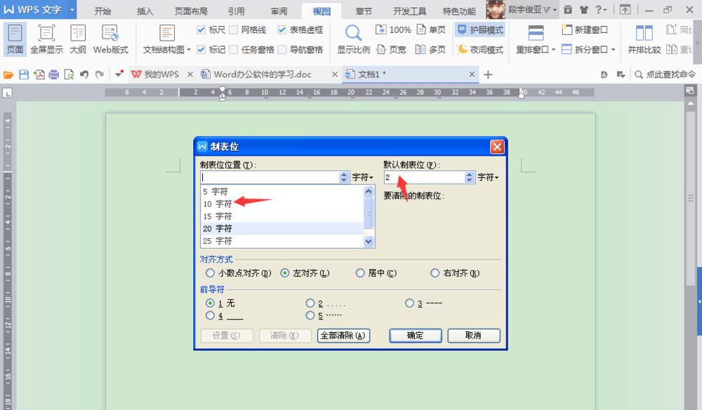 2、打开制表位对话框,默认制表位对话框是2个字符,选择制表位字符为5个字符,点击确定,然后输入10个字符,再点击确定,一次按照这个顺序调整字符标记的位置,这样很快就能设计好对齐的文字哦。