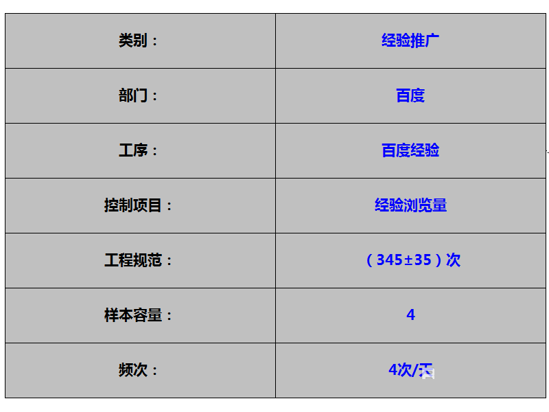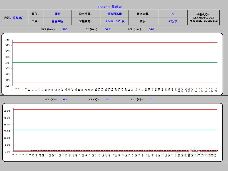 表头主要是涵盖以下详细信息,即类别、部门、工序、控制项目、工程规范、样本容量和频次,其中控制项目即为百度经验浏览量,这是整个Xbar-R控制图制作过程的核心,工程规范为某个时间要求经验浏览量范围(310-380)次。