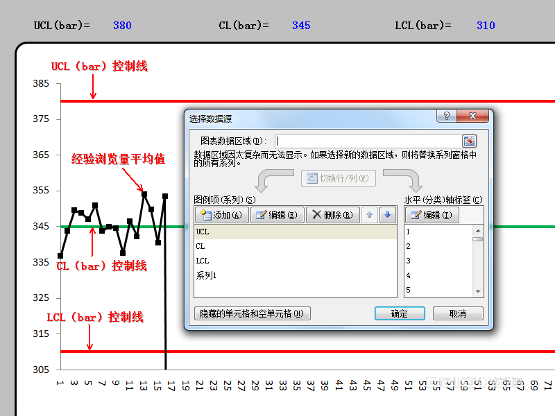 Xbar变化趋势线包括4条线,即实际控制经验浏览量的上限和下限(图中红色直线)、中值(图中绿色直线)、曲线(采集到经验浏览量数据),UCL=上限、CL=中值、LCL=下限,使用Excel表中折线图制作,数据源的选择如下图中所示。