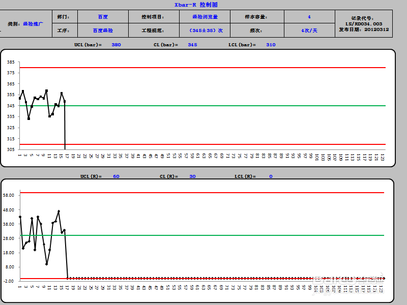 这样整个Xbar-R控制图就算制作完成,从而可以监控经验浏览量的变化过程,依据“八项判异准则”评估过程是否处于稳定状态,优于单一的趋势线控制,是精确度和准确度的双重控制,在企业中被广泛使用。