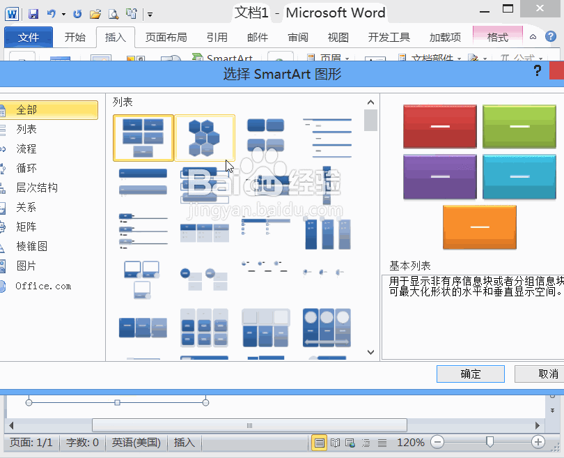 5、点击smartart选项在弹出的对话框内我们可以选择一种预设,如图所示: