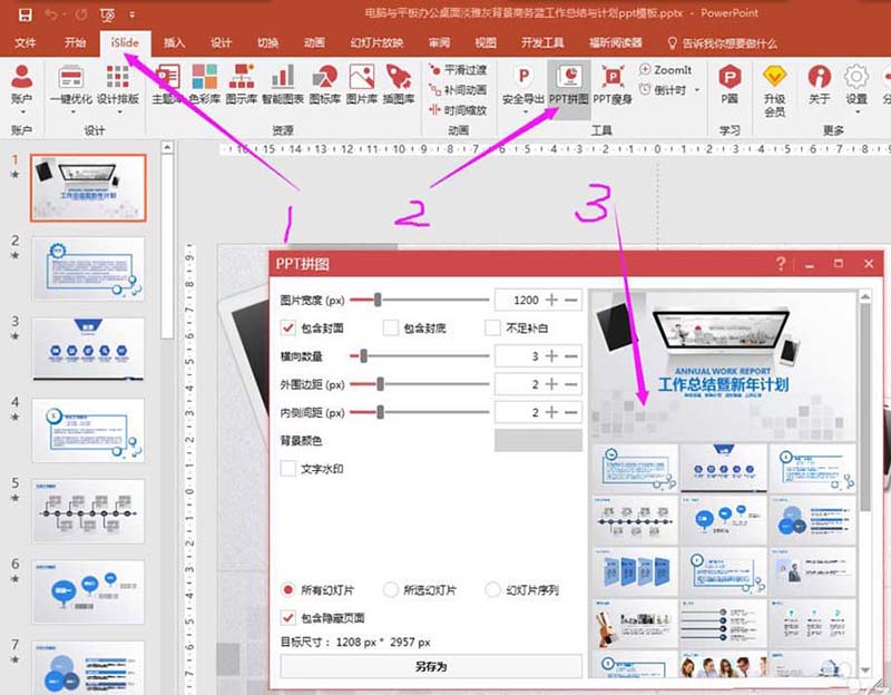 5、在菜单栏islide,点击【PPT拼图】,这时候会显示正在导出,如果PPT页数较多,会需要较长时间,耐心等候一下,即可看到已经生成了一个整个PPT的缩略图。如图。