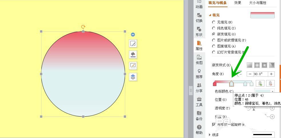 4、如图2箭头所示,点击第一个游标的标点,在右侧选择自己的颜色。我们可以看到图形的颜色发生了改变,出现了渐变。