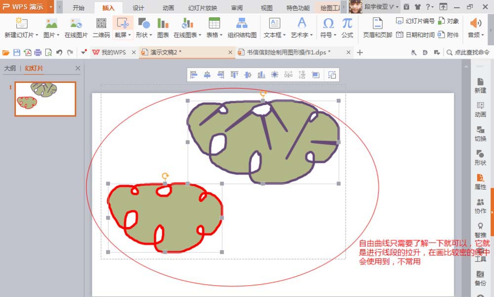 2、选择插入选项,选择形状工具,找到自由曲线工具S形状,按下鼠标左键自动绘制不同规则的图形形状。选择鼠标右键,为曲线增加轮廓颜色,可自由设置轮廓线的宽度,可设置为10磅,也可自动填充颜色。