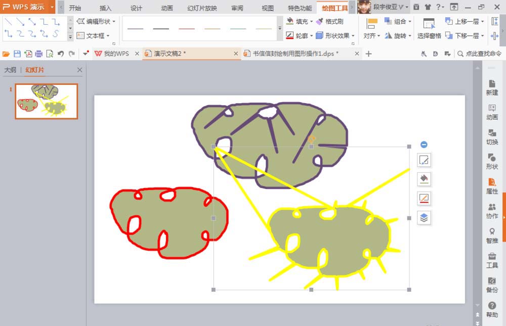 5、选择一个不规则的图形,按下鼠标右键,可自动的修改轮廓的颜色,将颜色设置为黄色,为轮廓线增加6磅,加粗形状的轮廓线等。如图