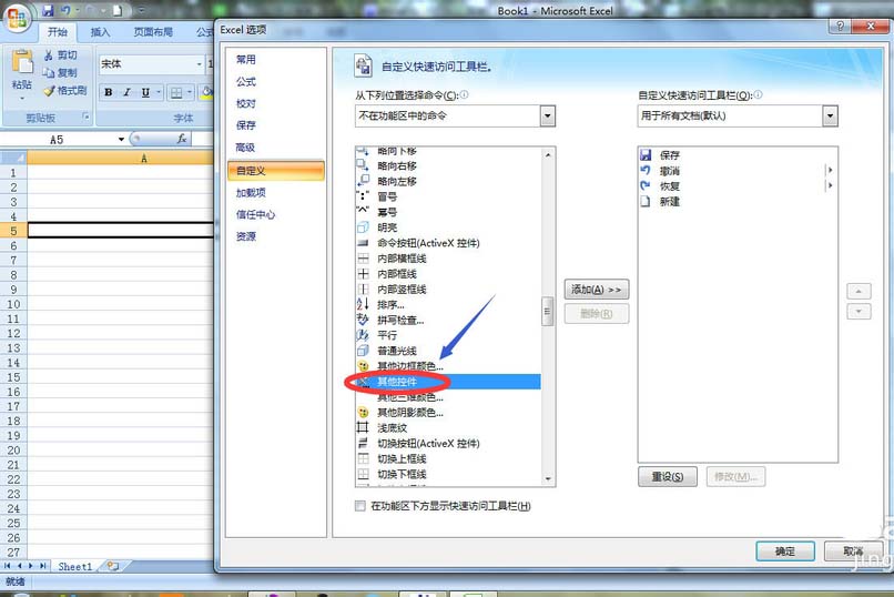 2、接着在弹出的”EXCEL选项“对话框最左侧选择”自定义“,然后将常用命令改为下拉菜单中的”不在功能区中的命令“,然后在此命令下找到”其他控件“,之后选择”添加“