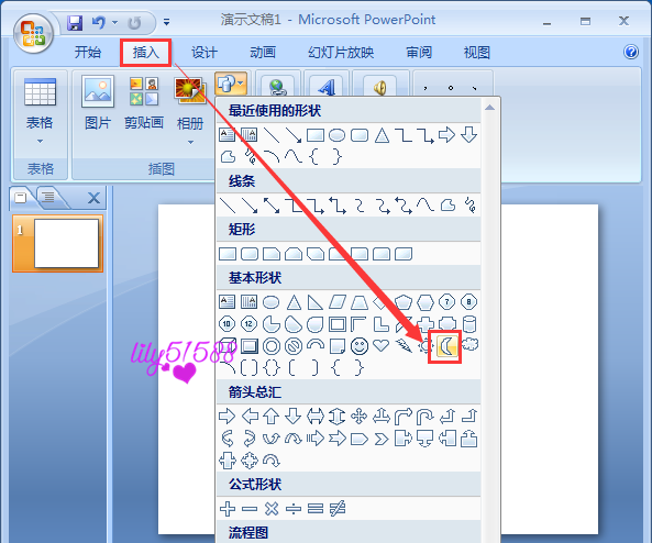 1、打开PPT软件新建一个文档,点击【插入】在形状里面,选择【新月形】,如图所示;