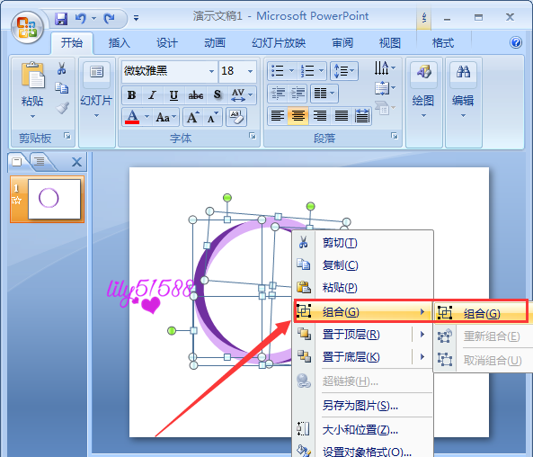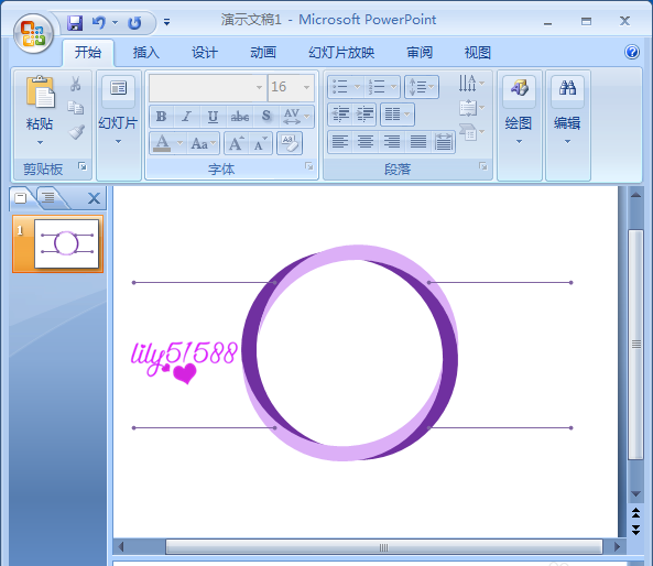 7、在圆环的中间输入标题的文字,比如:生产计划,字体的颜色填充为紫色,如图所示;