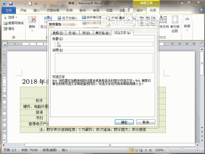 3、弹出表格属性对话框,点击可选文字选项卡,把光标定位在标题下方的文本框里。