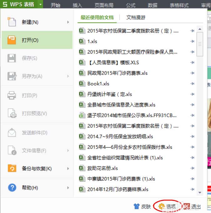 2、在点击【WSP表格】按钮后弹出的菜单下,点击选择【选项】。(如图所示)