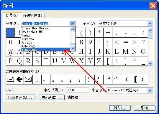 3、在字体一栏,下拉菜单,选择“wingdings”。