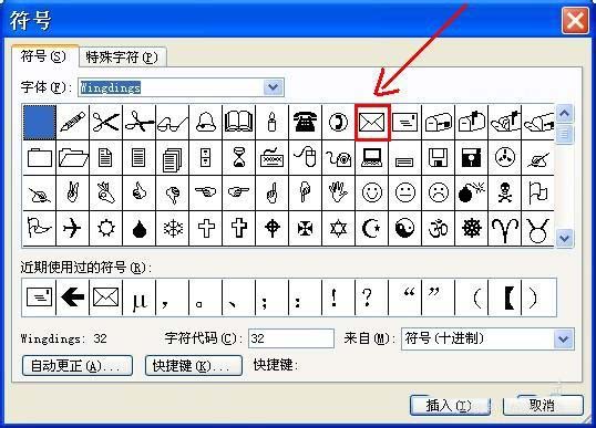 4、看到信封标志,插入即可。此时在word界面上就有了一个小小的信封图案。