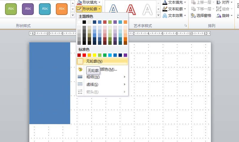 1、首先启动ppt2010,运行该程序,执行插入-形状命令,从中选择矩形,绘制一个矩形,设置形状轮廓为无轮廓。