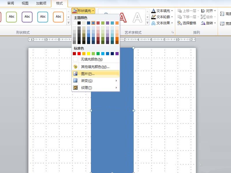 4、选择该矩形点击形状填充命令,从下拉菜单中选择图片,在弹出的插入图片对话框中找到图片,点击插入按钮,这样图片就填充到矩形中去了。