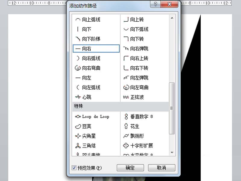 6、引动右边的三角形和左边的三角形重合形成一个矩形,选择左边的三角形,执行动画-添加动画命令,从中选择其他动作路径-向右,同理设置另一个向左,分别设置与上一个动画同时,时间为0.5s。