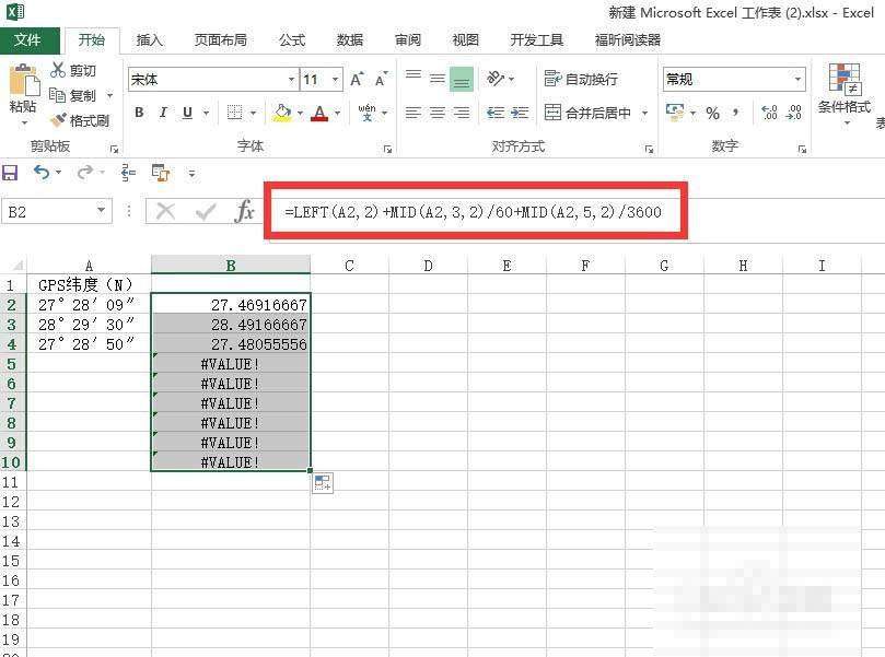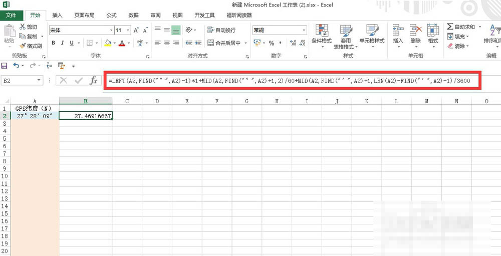 2、换算成度;在需要输入度的列输入公式:=LEFT(A2,FIND("°",A2)-1)*1+MID(A2,FIND("°",A2)+1,2)/60+MID(A2,FIND("′",A2)+1,LEN(A2)-FIND("′",A2)-1)/3600